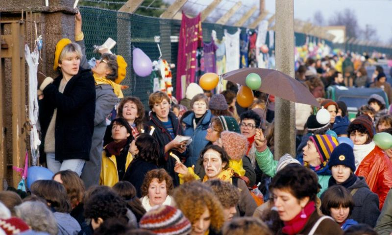 (A kép a Greenham Common-i női peace-camp szervezésében az USA angliai katonai bázisánál tartott egyik tiltakozó megmozduláson készült az 1980-as évek elején. Az interneten találtam a felvételt 2023-ban. Azt hiszem, középen a nő az arcára festett fehér békeszimbólummal én vagyok.)